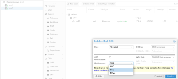 wenn nur SSD's und nur HDD's je einen replicated Pool (Default) bilden sollen, so müssen separate CRUSH rules vergeben werden. Die entsprechenden OSD's müssen bereits vorhanden sein.